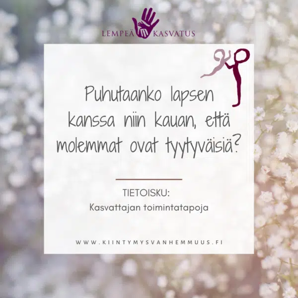 Kiintymysvanhemmuuden ajatuksena ei kuitenkaan ole se, että kaikesta pitää keskustella tai että aina pitäisi kysyä lapsen mielipidettä. Aikuinen johtaa arkea, kertoo mitä tuleman pitää ja oletusarvoisesti lapsi toimii yhteistyössä. Siinä tapauksessa, jos lapsi on eri mieltä, pysähdytään arvioimaan tilannetta uudestaan, ja yhdessä lapsen kanssa lasta kuullen pyritään ratkaisemaan tilanne.